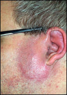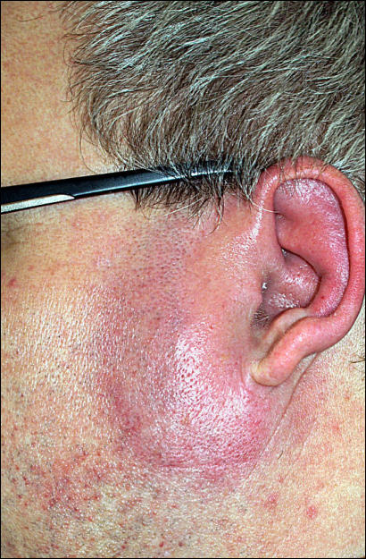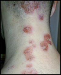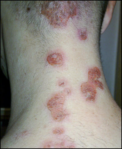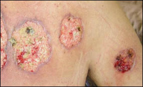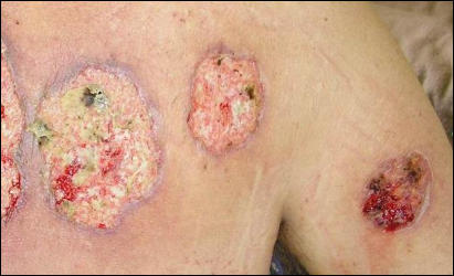 kızarık, kabarık kenarlı, şiş koyu renkli ülserlere